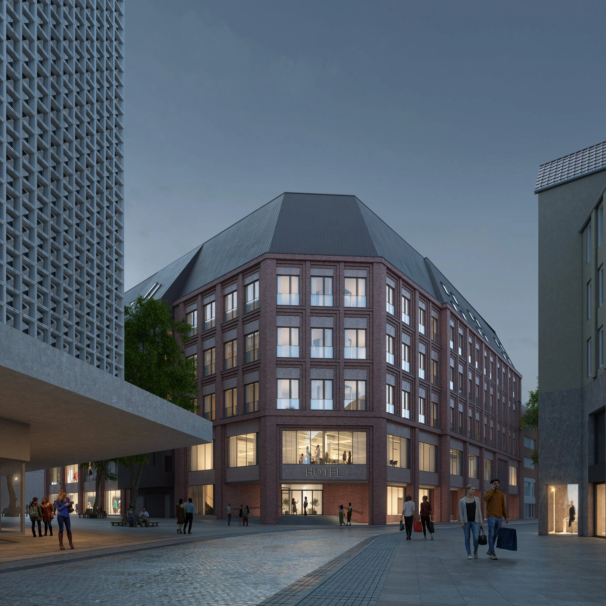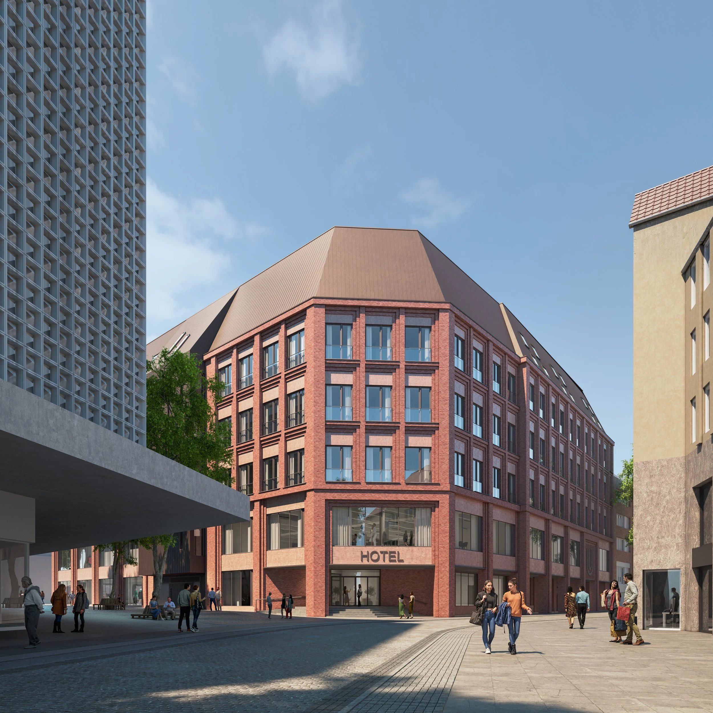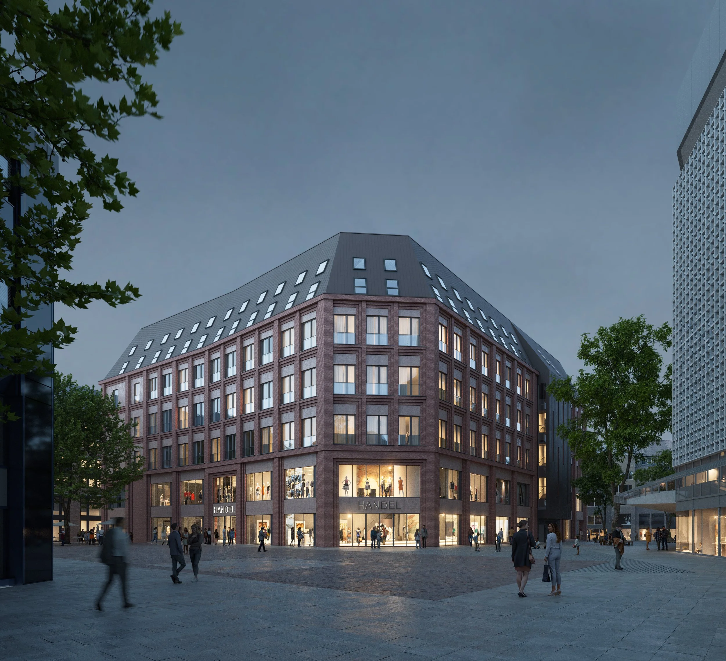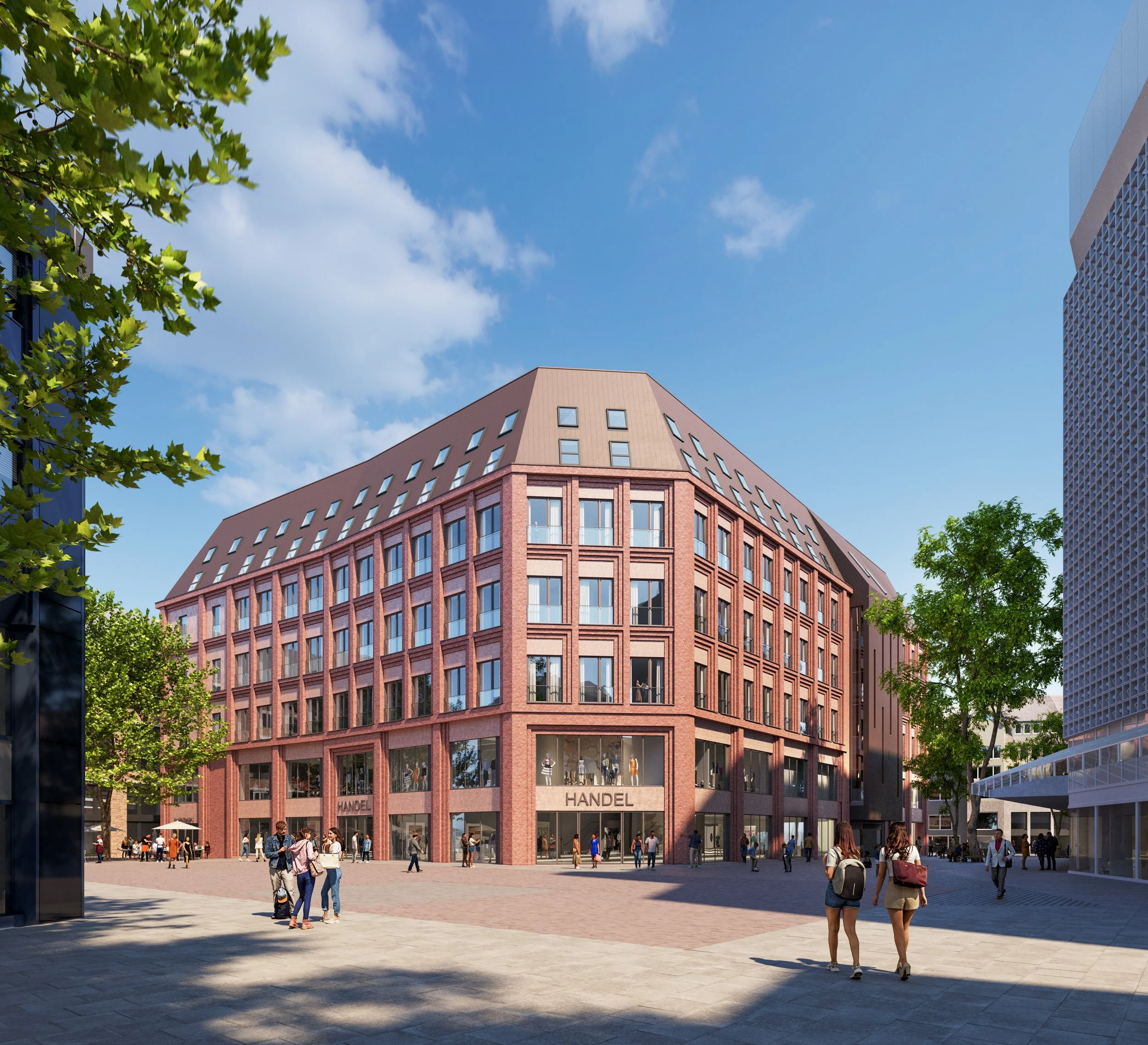 Verblendmauerwerk und Betonfassadenelemente geben dem Haus eine zeitgemäße Identität. Mit der Kombination aus Handel, Hotel und Universität entsteht ein offener Ort für Begegnung, Lernen und Versorgung – mitten in der Stadt.